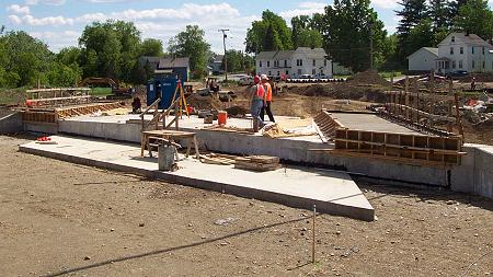 Here's a shot looking across the new bridge, facing south in the direction Route 7 will come. The wooden forms on each side contain the sidewalks and base for the railings. At least a couple more feet of base must be added to bring the road up to the bridge grade. Otherwise, Rick Leighton says the bridge will be the biggest speed bump Corinna ever had. |