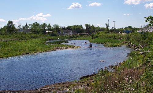 This picture shows the area from below the Upper Dam. This used to be the upper part of the Mill Pond. In the distance you can see the Methodist Church on the left and the Hemingway Building (Pearson's Store) near the center. |