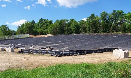 A large area has been cleared at the north end of the mill site, near the Upper Dam, for the location of the new contaminated soil stock pile. This plastic ground cover will form the base of the stock pile. The existing pile, now on the mill slab, will be moved to this location along with new soil excavated this summer. The soil decontamination equipment will operate on the slab next year. |