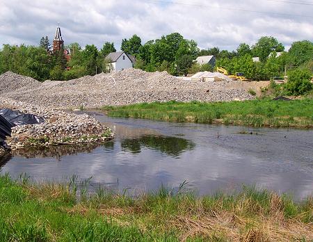 This is the view looking across the river toward the former location of the mill. The new river banks are flourishing. Huge piles of crushed rock still occupy much of the site. Compare this to a similar view from May 2000. |
