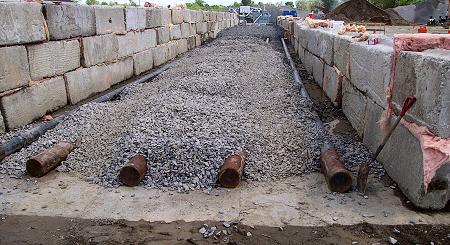 This is one of the soil decontamination areas still under construction at the former mill location. When the bed is complete, the pipes visible here will be buried under crushed rock. After placing about two feet of contaminated soil on top, hot air will be forced into the pipes to heat the soil. As the hot air comes up though the soil, the chlorobenzene will come out with it. A cover and blowers will collect the contaminated air and force it through a series of condensers and filters to remove the chemicals. In a few days the soil will be decontaminated. The cleaned soil will be taken away and replaced with a new batch to start the process over again. |
