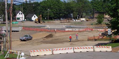 Down in front of the Stewart Library Building, the new section of road connecting to Route 7 is taking shape. Instead of the two ninety degree turns Route 43 now takes, there will be a gentle turn to the right and then a perpendicular intersection with Route 7 just south of the bridge. |