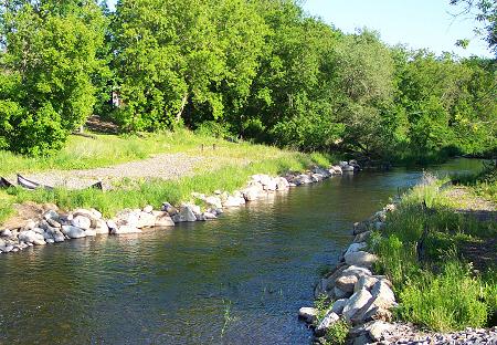 This is the East Branch of the Sebasticook River just below the recreational trail bridge in the Corinna village area. Although they don't show well in this picture, the lupines Carl referred to in the Guest Book are growing on the left bank just behind the rocks. |