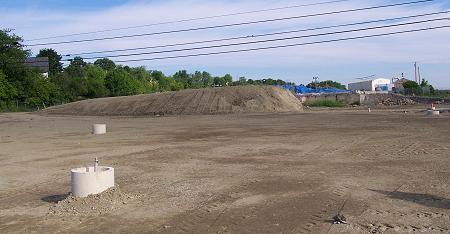 This is the area where the mill used to be. Winchester Park is just to the left. The pile of soil is cleaned and ready to use as fill. With this part of the site now filled in and rolled we can begin to see how this area will look when the cleanup is complete. |