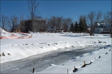 The Odd Fellows Hall looks quite natural in it's new location. The back of the building is visible in this picture was taken from the snowmobile trail near the river bank, facing roughly south east. The river is frozen over. |