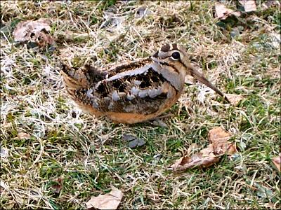 An now for a little wildlife photography. On the south side of the house, up next to the foundation, there a patch of ground where the snow has melted. This woodcock has been there for the past few days. As you can see, it let me get very close to take this picture. |