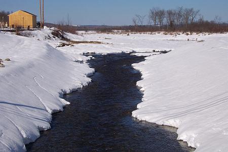 This is the newest section of stream bed on the East Branch of the Sebasticook, the area from the former mill pond to the new bridge. This picture looks north from the Route 7 bridge in Corinna. The Corundel Dam (Upper Dam) is hidden behind the bank on the left. The building is the EPA water treatment facility where all contaminated water recovered from the site is purified before release back into the river. |