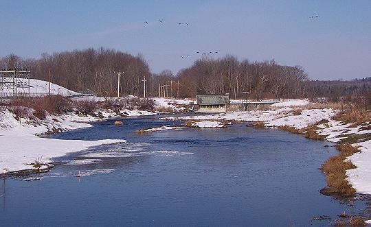 Now a free-running stream, this is the former Mill Pond area just below the Corundel Dam. Notice the ducks in the air. They flew off as I approached. The electrical substation is on the left. The mound behind it is a portion of the contaminated soil stock pile. There are about 75,000 cubic yards of excavated contaminated soil stored there. |