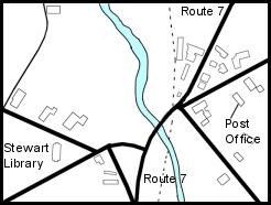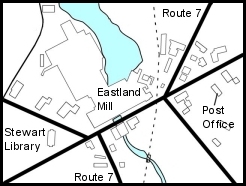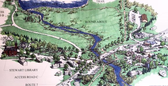 Click on this picture to view a large copy. This is a concept drawing of what the village area of Corinna might look like after the superfund cleanup is complete and redevelopment has begun. The drawing is part of the Reuse Plan for Corinna Village Center. The plan was prepared by Corinna's Reuse Committee using a redevelopment grant from the EPA and working with Gates, Leighton & Associates in coordination with the Eastern Maine Development Corporation. The Reuse Plan was adopted by the town at a recent town meeting. Below are two maps showing the layout of the Corinna Village area before the Superfund cleanup started and after the cleanup is complete. The restored land areas will be turned back to the town and ready for redevelopment by 2004. |