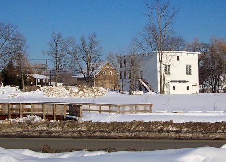 The back side of the Odd Fellows Hall shines in the late afternoon, winter sun. This is the view of the building from Route 7 through town. The railing on the recreational trail bridge shows in the left foreground. |
