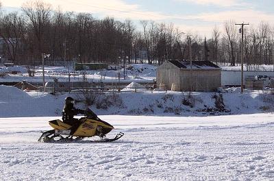 This picture of the snowmobile trail along the bank of the East Branch in the village area was taken early this month. It is the last gasp of snowmobiling for the winter. Most people have put up their sleds for the season. |
