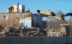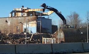 Action shots. Yesterday afternoon the duct-work that connected to the smoke stack was removed from the top of the boiler room.