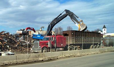 Lately, in Corinna... March 25, 2000 There is a great deal of debris to be removed. Trucks like this one come and go all day. The loaders work to move the debris toward the front. They back the trucks in along the barrier for loading. |
