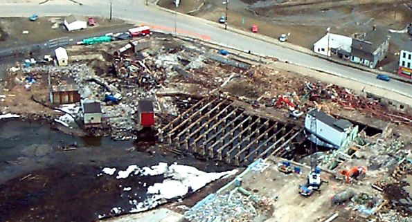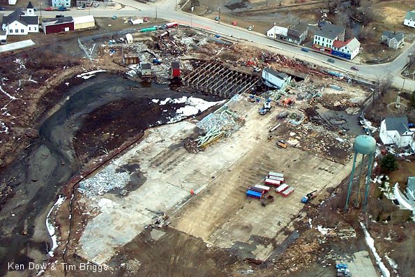 Lately, in Corinna... Click on this picture to view a larger copy. Tim Briggs took us up for a plane ride Saturday. (Thanks again, Tim.) There isn't much left standing. The piece over the dam, there are three very large sand filters in there that can't be moved until other material is out of the way. There are a couple of small buildings near the water that have not been removed yet. The most prominent feature is the i-beam construction that supported the floor of the round-roof section. |