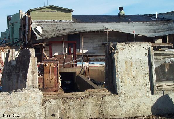 Lately, in Corinna... The only structure still standing is this piece over the dam. The contractors are being careful as they work around this part to avoid dropping debris into the stream. There are three large sand filter in here. They were used to filter the water taken in for the dye process. Click on this picture to view a larger copy.