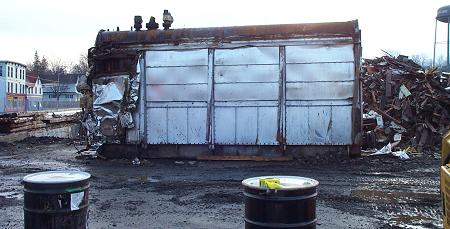 If you drive through Corinna these days you will see this thing. It looks like half a railroad car just inside the barrier on the east end of Main Street. It is one of the three boilers that came out of the building. I think the other two have been crushed. |