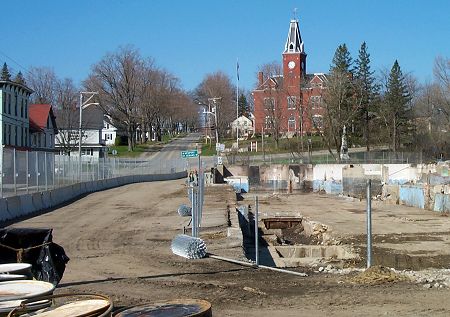 This view is from the east end of the site, almost opposite the park. The EPA says that the cellar holes will either be part of the contaminated soil excavation or they will be filled in and graded. The floors will be broken up to promote drainage. The concrete walls are being left up now for safety reason but will be removed during the excavation or before the final grading. |