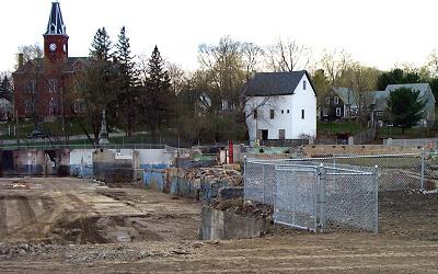 The new fence surrounding the cellars is in place. This opening is a gate at the ramp allowing access for the equipment. I don't think they will take down the barrier on Main Street, however. There is more work to do on the street requiring that the barrier remain. |