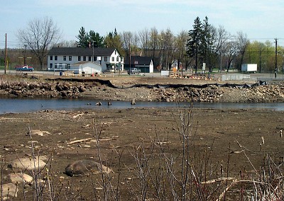 This photo was taken from the west bank of the mill pond looking to the southeast toward the corner of the Exeter Road and Route 222. The foreground of the picture is the bottom of the pond, dry now because the gates are open at the middle dam. Much of this area will become reclaimable land when the pond is converted to a stream. |