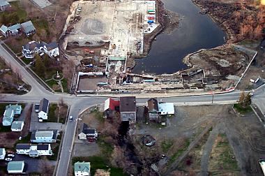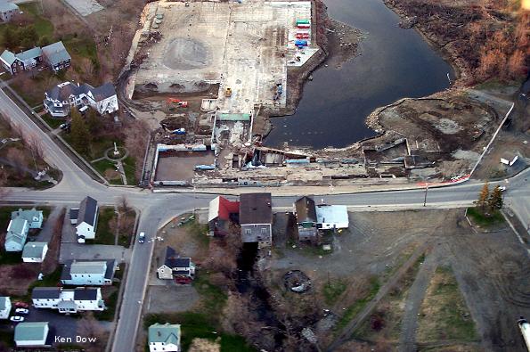 Click on this picture to view a larger copy. This aerial was taken near the end of April. It is an interesting view of the present river running under the Odd Fellows Hall. Notice the white square roof of Henderson's Store. The new river channel will cross the street and run on the right edge of that building. The channel will join back into the present river somewhat below the edge of this picture. |