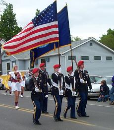 This is the color guard from the JROTC at Nokomis Regional High matching in front of the band. The photo was taken on Main Street in Newport.