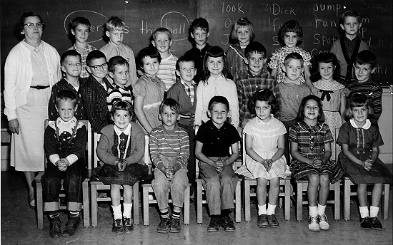Thanks to Mel Russell for sending this great picture of Mrs. Bird's first grade class from 1961 in Corinna. He identifies them as follows. First Row: L to R, Mel Russell, Lisa Rockwell, Coleman Butler, Richard Maguire, Patty Veazie, Jolene Bouchard, Nanette Carr. Second Row: Mrs. Dot Bird, R. LeMay, Roger Dearborn, Kenneth Brown, Linda Hartley, D. Jackson, Joanne Newcomb, Reginald Nelson, Vern Carlowe, Sharon Costello, Tom Ricker. Third Row: Michael Larrabee, William Call, R. Parker, Ross Bell, Venita Hunt, Sandra Ervin, Rob Gustin. Can anyone provide the first names where we only have an initial? [Thanks to everyone who sent names to the Guest Book.] |