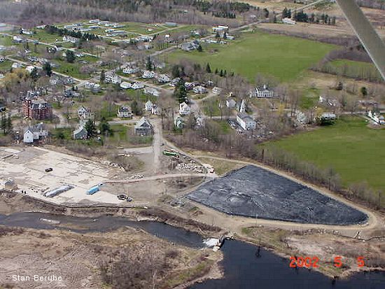 Here's another of Stan's aerials showing the cleanup site north of Route 7 in Corinna. The large flat area on the left is the concrete slab remaining from the former mill location. The black mound on the right is the big pile of contaminated soil (BPCS) under a huge black tarp. Next month a soil decontamination plant will begin operation on the slab. With 75,000 cubic yards of soil to clean up, the process will not be complete until next year. |