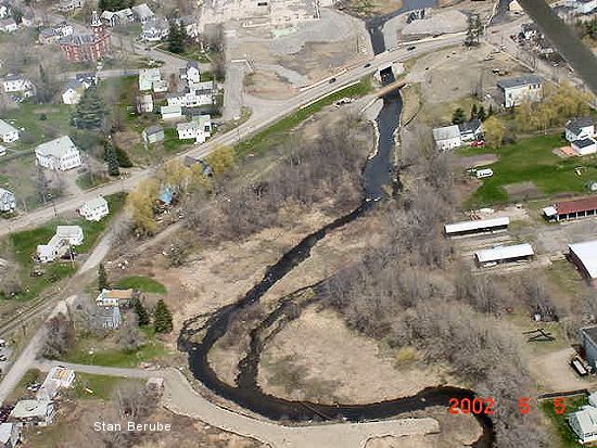 Again Stan provides us with a picture of the Corinna village, this time the area south of Route 7. The bridge and the recreational trail bridge show clearly here. The river meanders through the area that used to be the lower mill pond. Notice the gravel roadway (at the bottom of the photo) built out into the former pond. The EPA constructed it to facilitate drilling monitoring wells and the sampling of river sediments. There is significant contamination in spots along the river for a mile or more. The EPA will hold a public meeting in Corinna on June 5 to tell us more. |