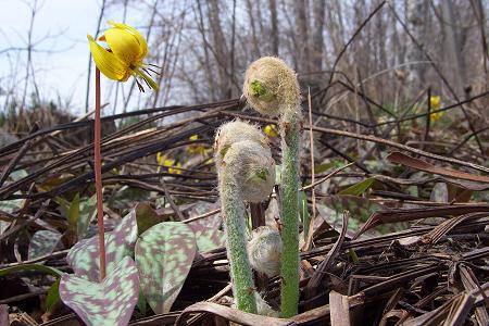 Dog-toothed violets and ferns are up and growing fast here now. Won't be long before black flies will be in "full bloom" too.