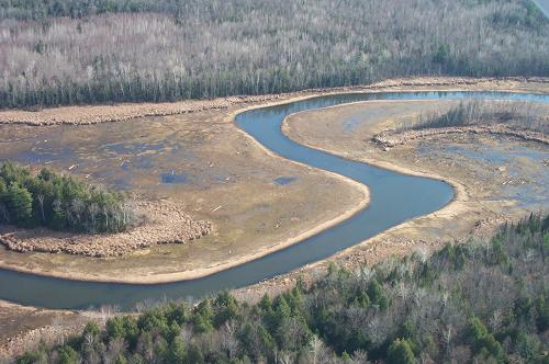 This aerial was taken in November of 2000. It shows an area of the East Branch of the Sebasticook River at low water. This section of the river is a mile or two downstream from Corinna. The main channel of the river winds though an extensive wet land. The area seems barren in this late Fall photo. However, during the summer it is lush, green and productive, as we saw in the pictures posted on May 18 and May 20. |