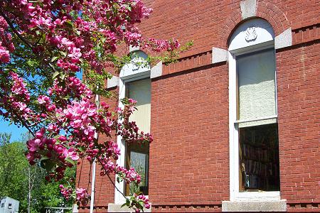 The flowering crabapple trees are in full bloom outside the Stewart Library Building.