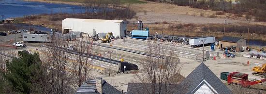 This picture of the soil treatment facility was taken from the bell tower of the Stewart Library Building. The long structures in the center, made from concrete blocks, are the soil treatment bins. Each bin is divided into two units that can hold about 500 tons of soil for decontamination. In the bins the soil is heated to around 150 degrees using hot, moist air from propane furnaces. The heat drives off the contamination which is then collected in charcoal filters. After decontamination the soil is safe for unrestricted human contact and can be used in residential or industrial locations. The EPA's goal is to complete the soil treatment by 2004. The treatment facility and the mill-floor slab will be removed in 2005. |