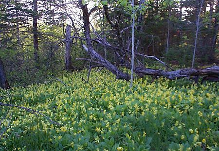 The picture above was sent in by Lois Rowe. She also sent the following message: "Last year on May 24, 2002 you (and your readers) helped me identify a flower that my husband and I found growing deep in the woods of Dixmont. It was identified as a cowslip. I made another trip into the woods this evening with my daughter Katie and took a photo of the original bed. I thought that I would share it with you (and your readers if you would like). Looks like the old apple tree has seen better days and has uprooted, although it still has some new leaves budding out on a couple of the branches. I think that these flowers must have been planted here to mark someone's gravesite. I guess we will never know. Lois Rowe" Thank you, Lois, for sending in the photo and your thoughts about the cowslip and the old apple tree. It is interesting to see the area a year later and speculate about how the plant came to be there. |