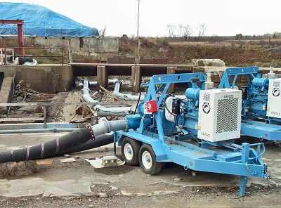 These pumps are located just in front of the Middle Dam on the north side of Main Street. They run all day and night, pumping the East Branch of the Sebasticook River around the cleanup site. The metal intake pipes extend through the dam in the background to pick up the river flow. The black pipes leading of the the left go under the street and down the side of the old river channel. The water is released back into the river bed well below the cleanup area. Because of low rainfall amounts this Summer, the pumps have handled the river easily. Spring run-off however, will be a different story. Before long, the river will return to its old channel for one last season. |