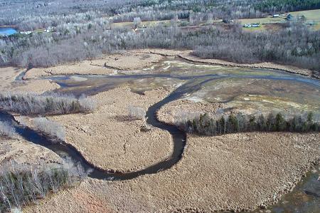 Let's continue looking down stream of Corinna. In this picture, the East Branch of the Sebasticook River forms the s-curve in the lower part of the photo. The blue water in the upper left corner is the Swim Front, the Alder Stream behind the dam on the Stetson Road. Notice where that stream comes out of the woods, onto the wetland, and runs in a separate stream, eventually joining the river. This link will take you to another view of this same area taken from a different angle last June. |