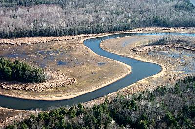 Here's another picture of the East Branch of the Sebasticook River, downstream from Corinna. This shows an area just above the County Road Bridge. Notice, on the right, the narrow piece of dry land curling out toward the center of the channel. For another view of the river, follow this link to a picture taken back in June 2000. |