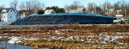 The contaminated soil stock pile has been re-covered with a winter cap. This black cover looks stronger than the blue tarps. Notice the tie-downs that now cross part of the pile. The cover is also anchored with weights. The pile was reshaped before the new cover went on to be sure water would run off. The EPA says the pile will be checked regularly throughout the winter, especially during storms, to be sure the cover remains intact. Soil decontamination was to begin this year in a pilot project testing the thermal treatment system. However, the 18,000 cubic yards presently in the pile is about three times more soil than originally estimated. The goal now is to treat all of the soil starting in late Spring next year. |