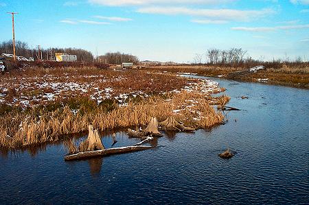 This picture shows the East Branch above the Middle Dam, this time looking up stream. The Upper Dam is visible in the distance. This used to be the Mill Pond. However, the Middle Dam will be removed. It will not be a pond after that. According to the current plan, next year the water flow between the two dams will be diverted with pumps while this area is rebuilt to provide a more natural stream environment. |