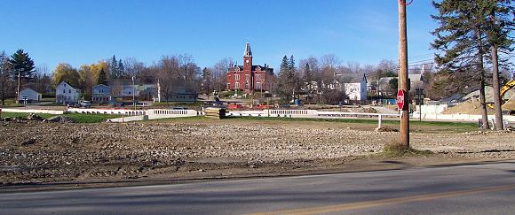 This is the view from the Stetson Road looking back toward the village center. This view has only recently been revealed as the dirt storage pile by the Odd Fellows Hall was removed. Now we can begin to see the areas of land on this side of Route 7 that will be available for development when the clean up is complete. |