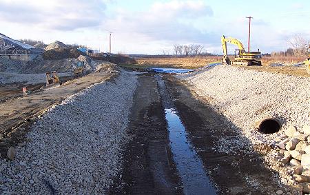 North of the Route 7 bridge, the new river channel is taking shape. This channel crosses the area where the mill used to be, connecting the former mill pond to the river bed under the bridge. |