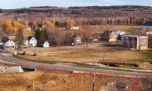 This picture was taken a few days ago from the clock tower of the Stewart Library Building. You see Route 7 coming through town across the lower portion of the photo. Running across the center is the Stetson Road, starting at the Hemingway Building (Pearson's Store) on the left to the Odd Fellows Hall on the right. The building in the center is Petals Plus, the flower shop. The TDS Telecom office is just behind the Odd Fellow Hall on the other side of the road. Notice the new recreational trail bridge on the right. The vacant lots along the Stetson Road from the corner to the OFH will be the first ready for redevelopment, prime business locations. |