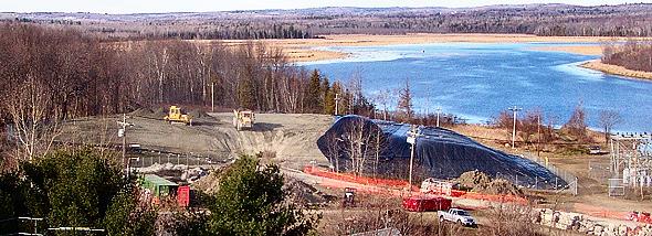 This picture of the new contaminated soil stock pile was taken from the tower of the Stewart Library Building. The containment area extends from the woods behind the Pleasant Street Church, on the left, down to the electrical substation on the right. Part of the pile was covered with a black tarp. You can see a dump truck and bulldozer working as more soil is added. |