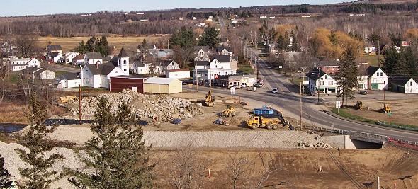 The new river bed, north of the Route 7 bridge, can be seen in this picture taken from the bell tower. The sides are steep and lined with rocks. It has been dry so very little water is running in the channel now. |
