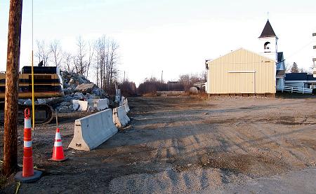 Just north of Route 7, in the center of town, the recreational trail is open and clear again. Here we see the trail, now a straight shot up the old railroad bed from the street. The yellow warehouse and the Methodist Church behind it are to the right of the trail. |