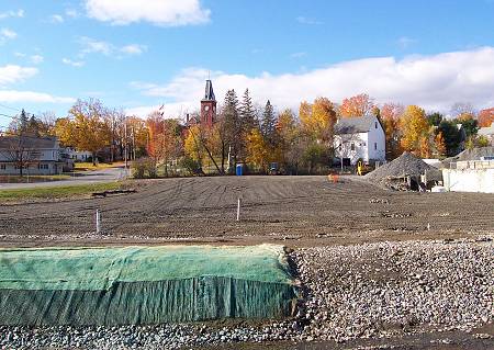 This is the former location of the Eastland Woolen Mill in Corinna. This picture looks roughly west, across the new stream bed toward Winchester Park and the Stewart Library Building. The photo was taken from a point near where the mill office parking lot used to be. A year ago there was a hole here 39 feet deep. Soon it will be completely filled in and ready for redevelopment. |