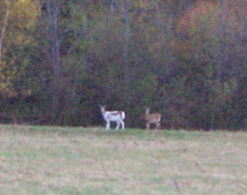 Here's another picture of the multi-colored deer and the usual companion (we always see them together) from the field behind my house. It's fuzzy but a little better than the last one. Mary Bowden sent in a message from a friend saying that a deer with this coloration is called "piebald". He says it is pretty rare, but occurs in nature much more frequently than albinism. |