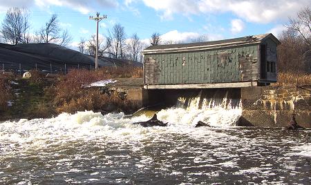 This picture of Corundel Dam (the Upper Dam) with water flowing over the top of the gates was taken yesterday. There is plenty of water in Corundel Lake these days. The smooth black mound in the background on the left is part of the contaminated soil pile from the Eastland Woolen Mill Superfund site. |