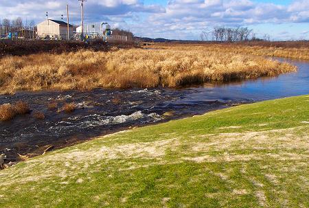 This is the view looking up stream from the former mill location. A sloping lawn now leads down to the East Branch of the Sebasticook River just above the Route 7 bridge. The soil and water treatment facilities show in the background on the left bank of the river. These structures are temporary. They will be removed in a year or two, after the soil treatment process is complete. A permanent water pumping and treatment facility will be constructed later on. |