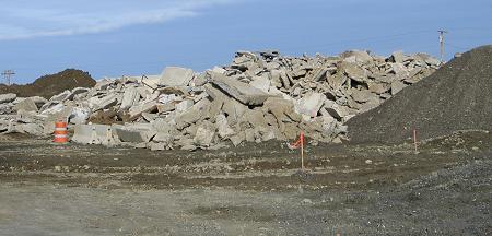 Removal of the concrete floor, the last remnants of the Eastland Woolen Mill, is producing this pile of slabs and broken pieces.