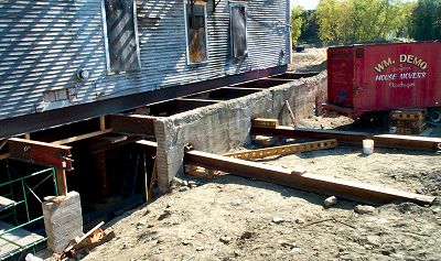 Late yesterday the last of the original support beams was pulled out from under the Odd Fellows Hall. It now rests on the temporary supports placed under it for the move. Sometime next week, they will winch the building off the foundation and place it on wheels. |